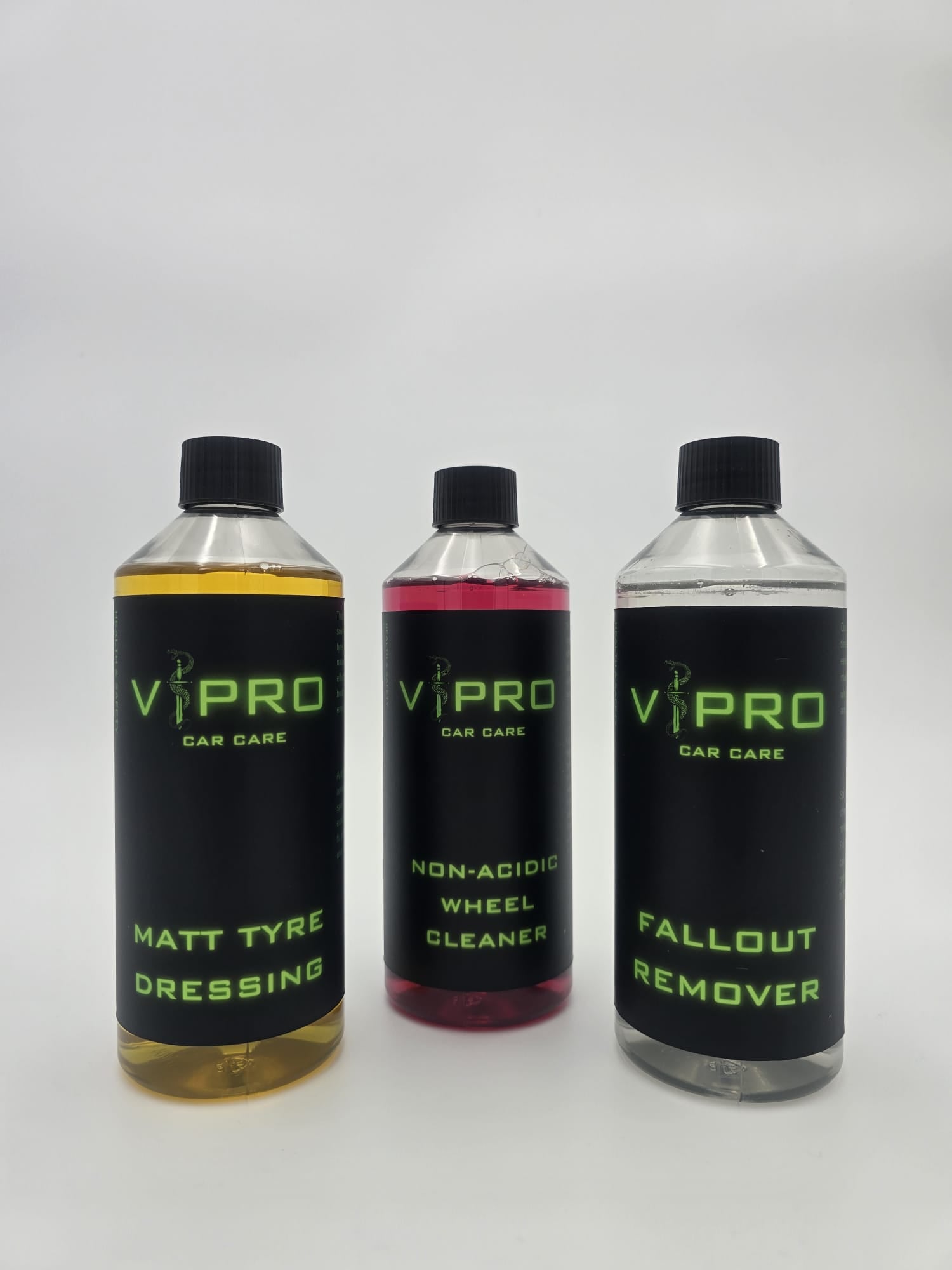 The Vipro Car Care Wheel/Tyre Bundle includes 500ml Non Acidic Wheel Cleaner, 500ml Fallout Remover and 500ml Matt Tyre Dressing.